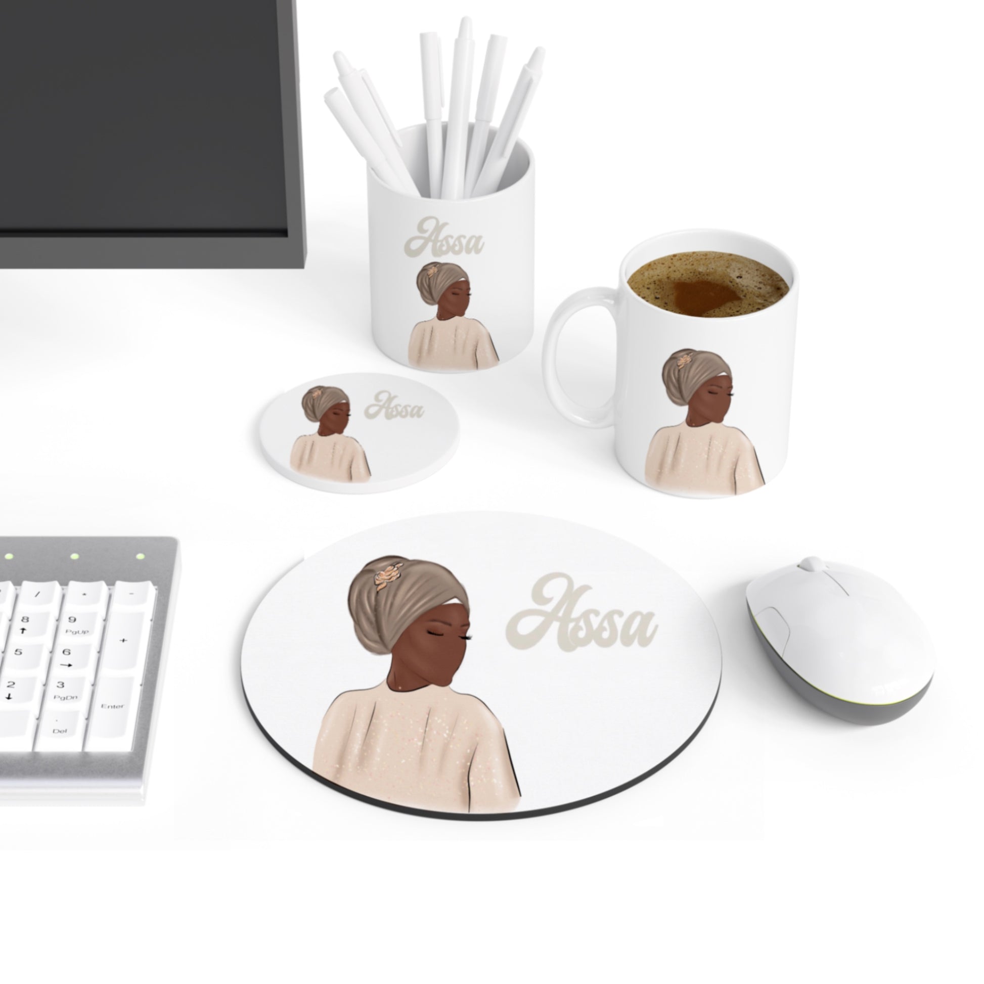 Une box bureautique personnalisable contenant : Un mug, Un pot à stylos, Un dessous de verre et Un tapis de souris une idée parfaite pour un cadeau professionnel ou personnel. (Le prénom pour le mug se trouvera a l'arrière)
