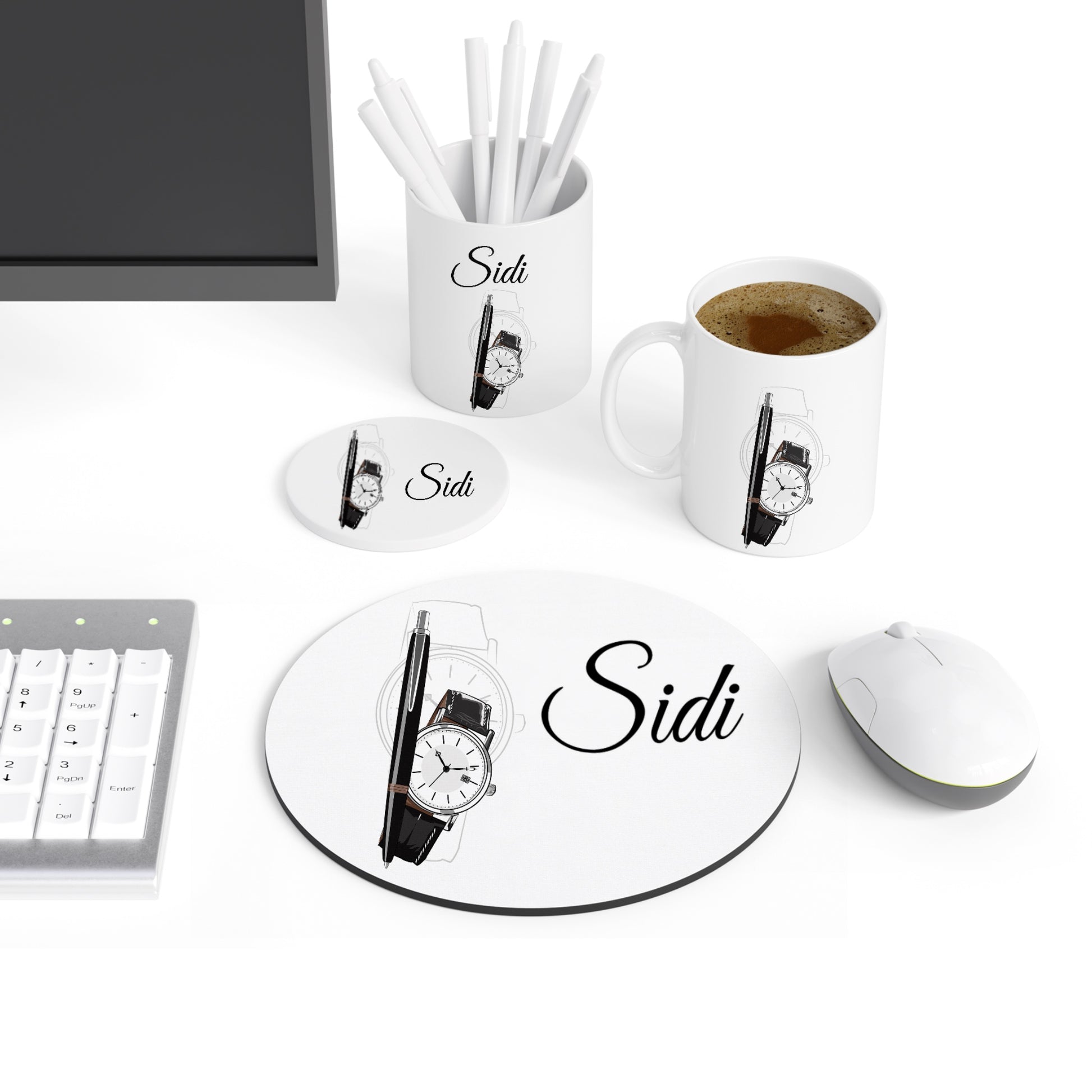 Une box bureautique personnalisable contenant : Un mug, Un pot à stylos, Un dessous de verre et Un tapis de souris une idée parfaite pour un cadeau professionnel ou personnel. (Le prénom pour le mug se trouvera a l'arrière)