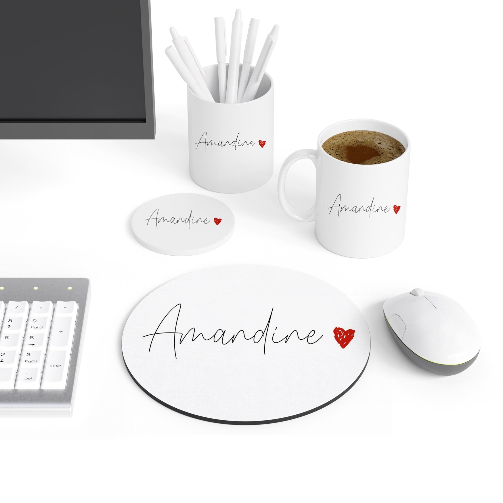 Une box bureautique personnalisable contenant : Un mug, Un pot à stylos, Un dessous de verre et Un tapis de souris une idée parfaite pour un cadeau professionnel ou personnel. (Le prénom pour le mug se trouvera a l'arrière)