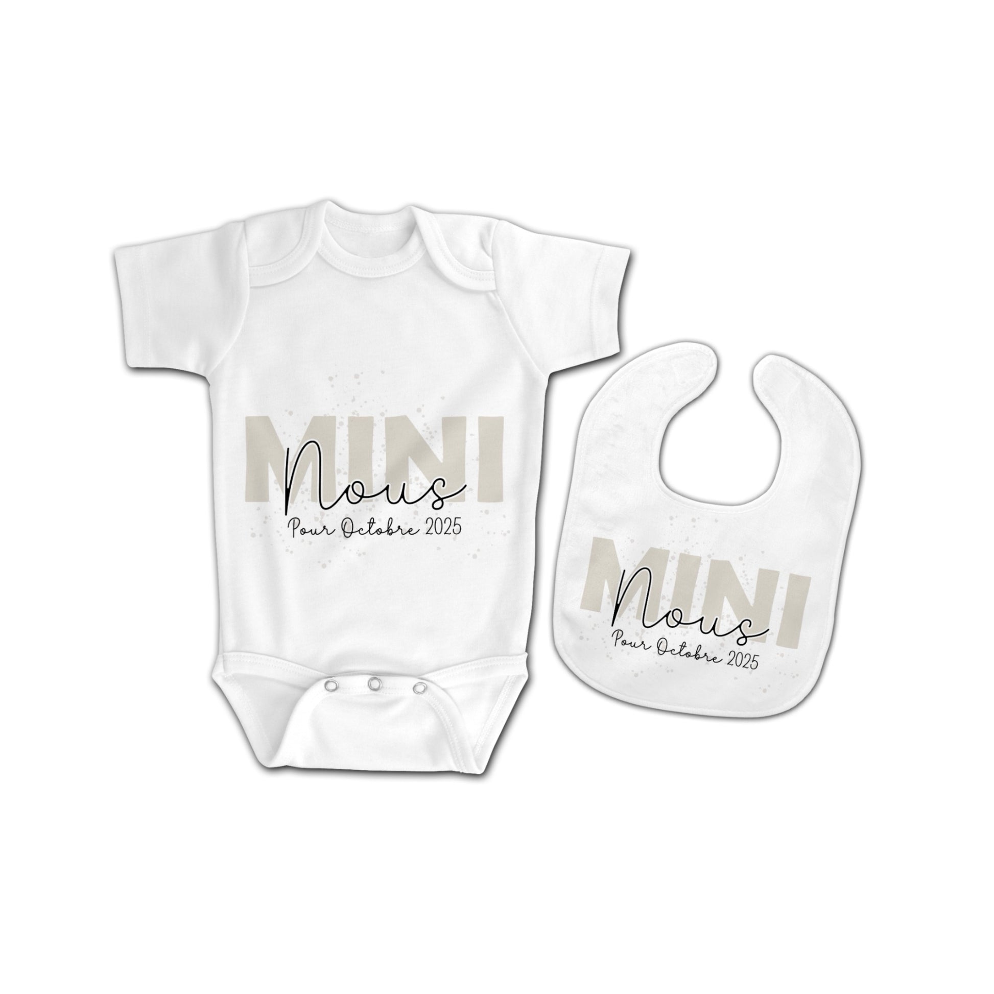 Cette ensemble contient un body et un bavoir personnalisés pour votre bébé. Une surprise unique pour célébrer l'arrivée de votre petit trésor.