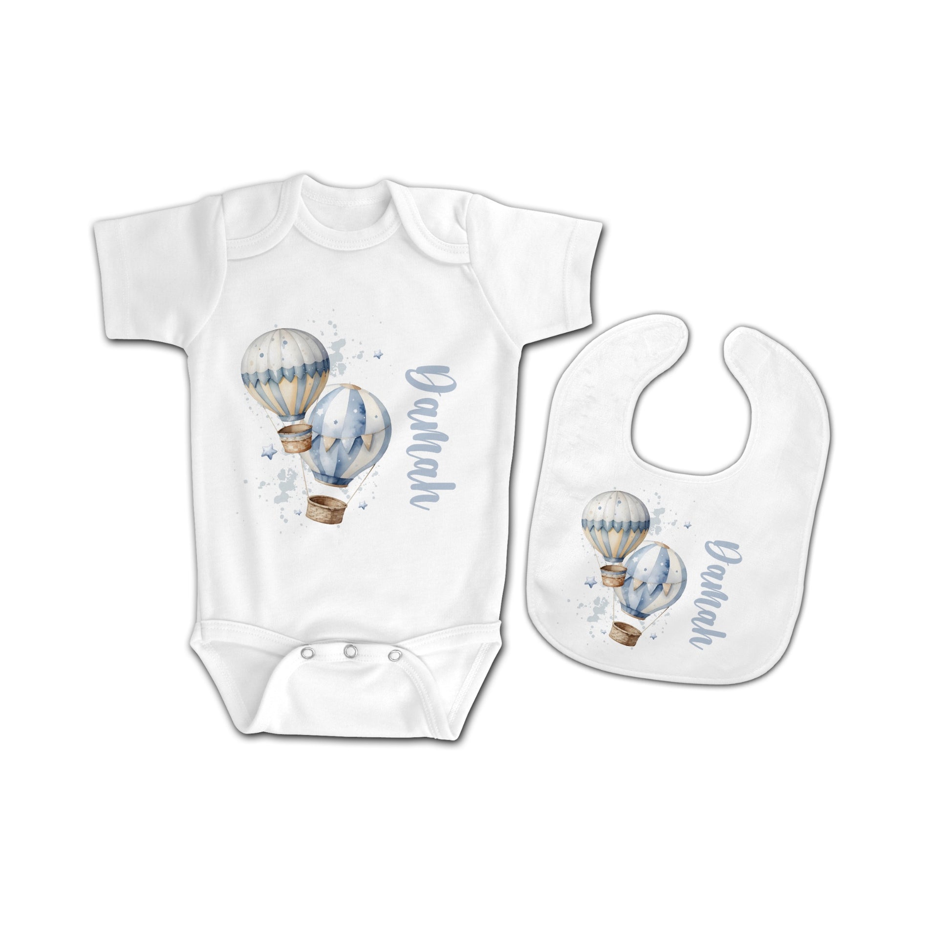 Cette ensemble contient un body et un bavoir personnalisés pour votre bébé. Une surprise unique pour célébrer l'arrivée de votre petit trésor.