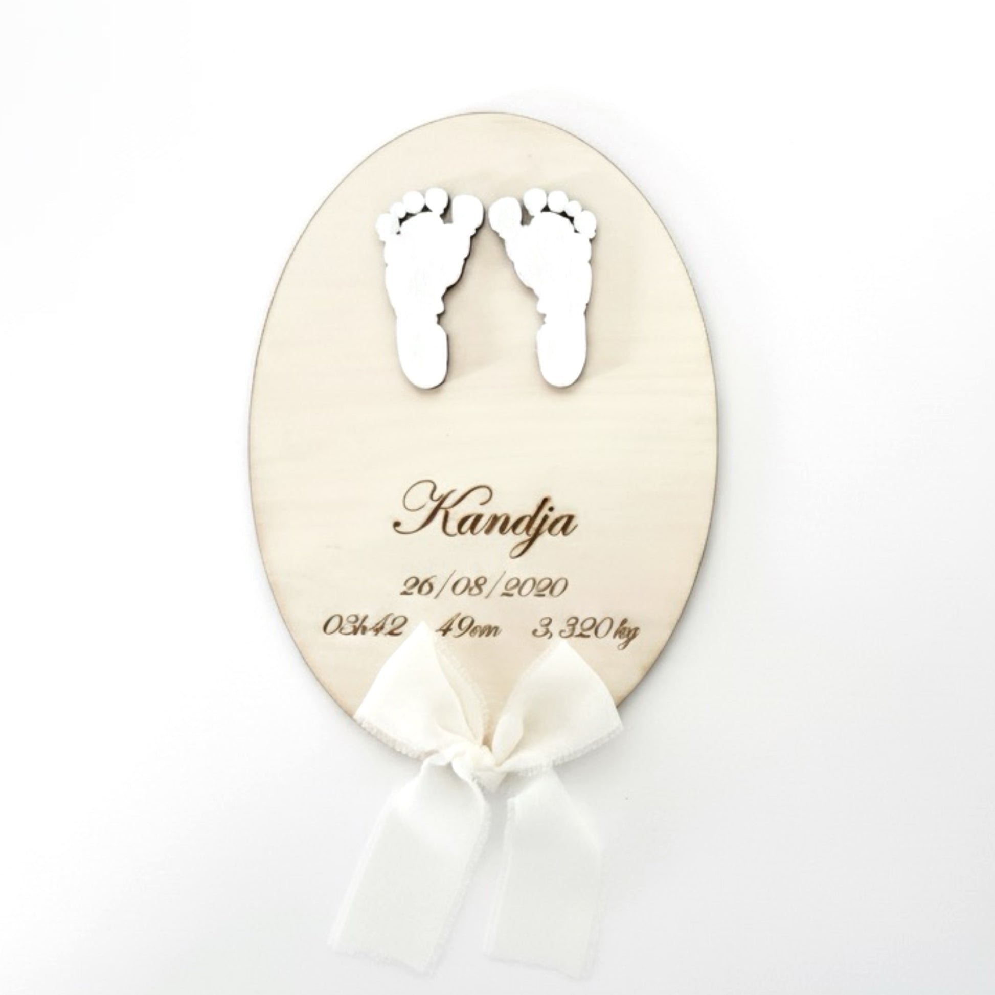 Profitez d'un souvenir unique avec la Plaque naissance avec empreinte en bois "Gravure". Sa forme ovale et ses empreintes de pied en bois apportent une touche d'originalité. Les empreintes seront toutes identiques, offrant ainsi une finition parfaite. Un cadeau de naissance précieux pour chérir des moments inoubliables.