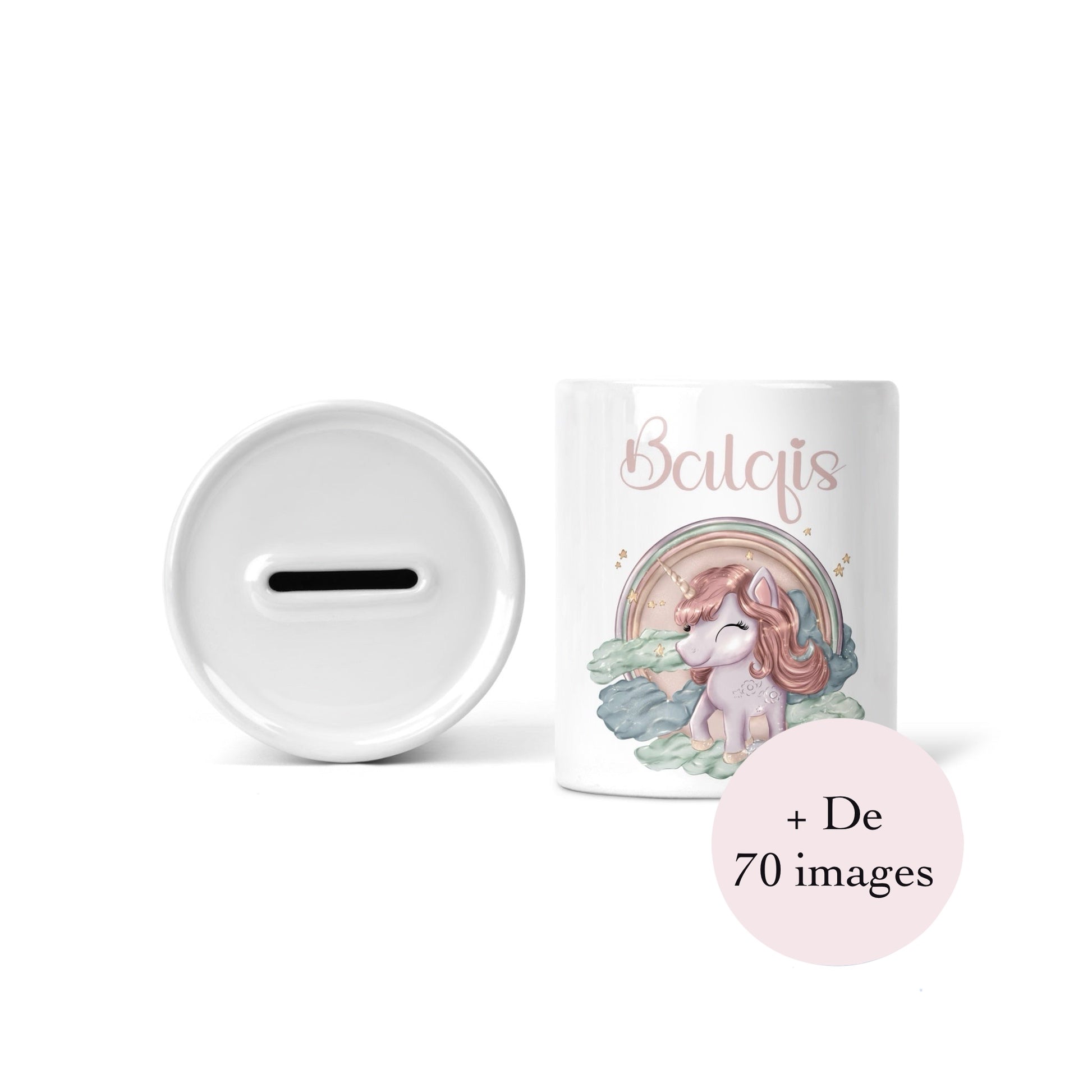 La tirelire enfant est en céramique. Avec son design ludique, elle permet aux enfants d'économiser tout en s'amusant. Garantissez l'apprentissage de la gestion de l'argent dès le jeune âge avec cette tirelire éducative.